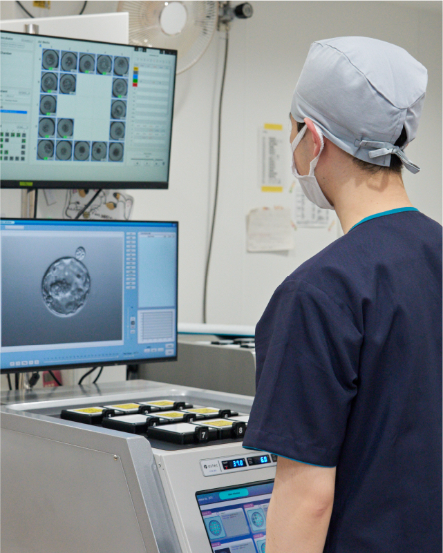 最先端の医療機器を備えた培養室において、光・温度・湿度を常に管理し、卵子・精子・胚にとって最適な環境を維持しています。また、一人ひとりに最適な培養技術を提供できるよう、日々研鑽を重ね、患者様にとって納得のいく治療を目指しています。採卵時の卵子グレードの説明や、精子・卵子・受精方法についてのご相談にも対応いたします。
