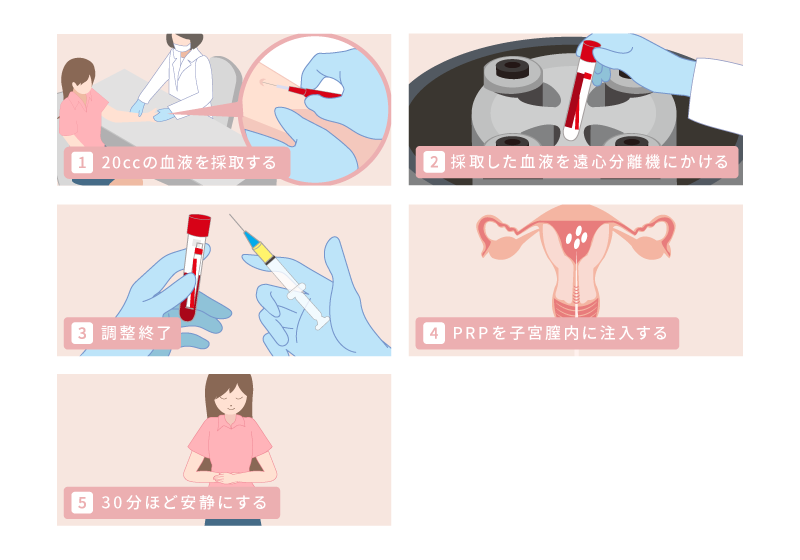 - 調整したPRP(約1ml)を患者様の子宮膣内に移植カテーテルを用いて注入、もしくは経膣超音波下に注射針を用いて卵巣内に注入します。感染予防のために抗生剤を処方します。