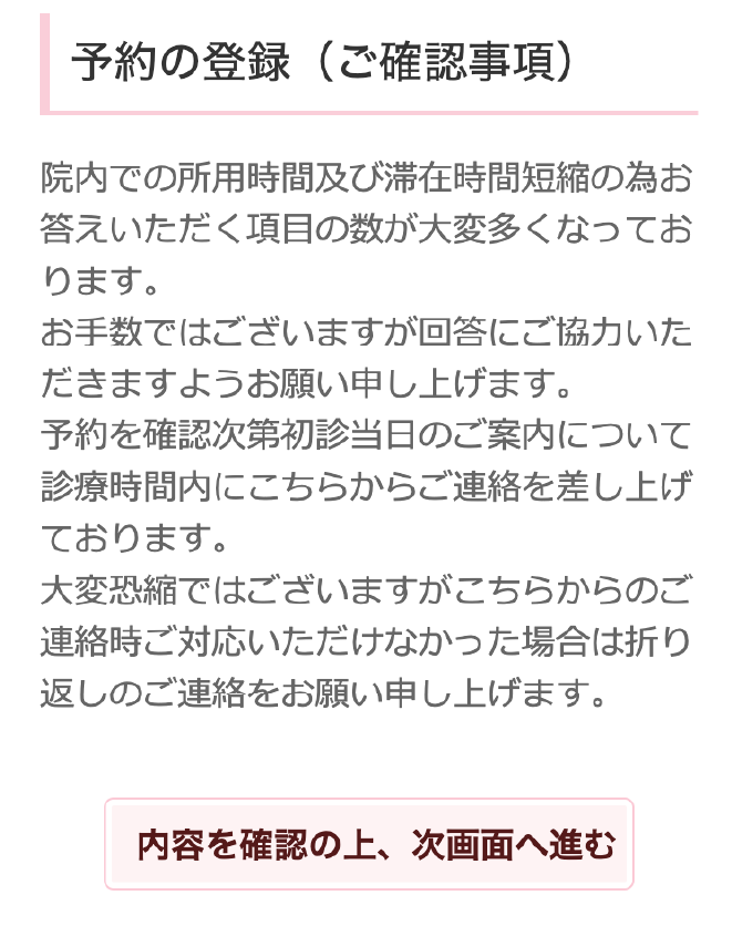 こちらからの連絡時にご対応いただけなかった場合は、大変恐縮ですが診療時間内に折り返しのご連絡をお願いいたします。 - 当院に通院歴があり、2人目・3人目の希望にて初診扱いとなる方もWEB問診票にご協力ください。